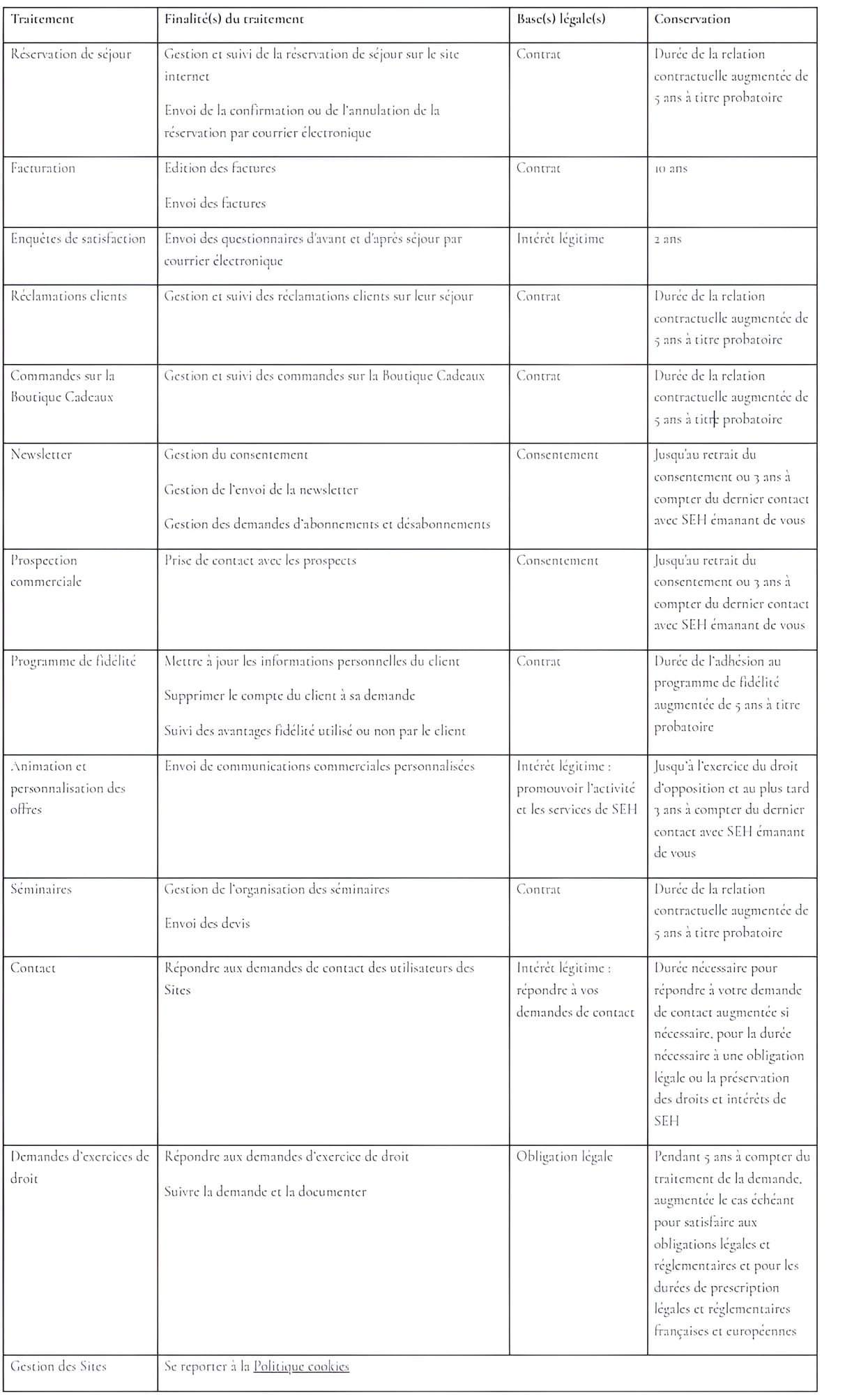 Vous trouverez ci-dessous les fondements (bases légales) et durées de conservation que nous appliquons aux traitements réalisés sur vos Données :